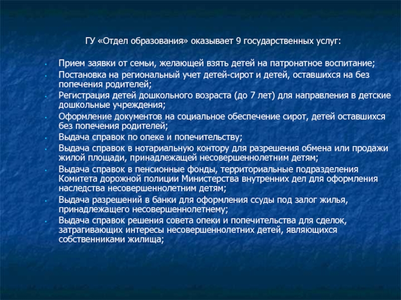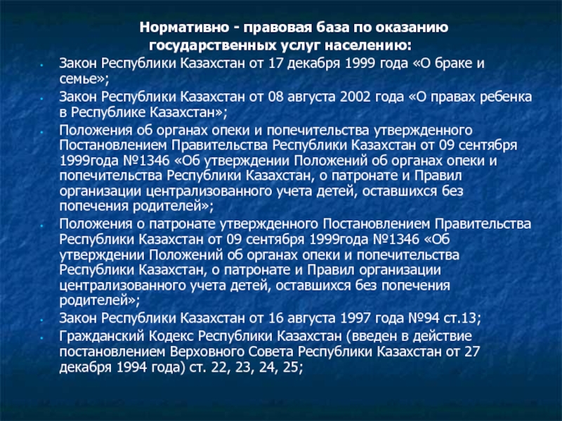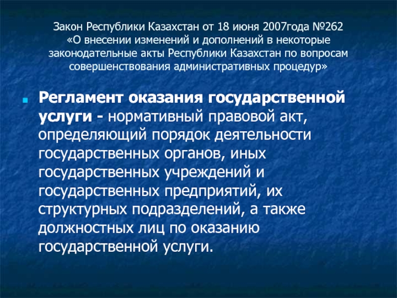 Регламент оказания государственной услуги - нормативный правовой акт, определяющий порядок деятельности государственных органов, иных государственных учреждений и государственных предприятий, их структурных подразделений, а также должностных лиц по оказанию государственной услуги.