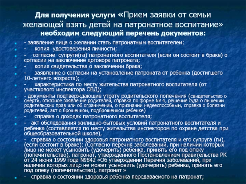 - справка о состоянии здоровья патронатного воспитателя и его супруга (ги), (если состоит в браке); (Согласно перечня заболеваний, при наличии которых лицо не может усыновить (удочерить) ребенка, принять его под опеку (попечительство), патронат, утвержденного Постановлением правительства РК от 24 июня 1999 года №842 «Об утверждении Перечня заболеваний, при наличии которых лицо не может усыновить (удочерить) ребенка, принять его под опеку (попечительство), патронат »