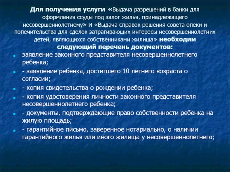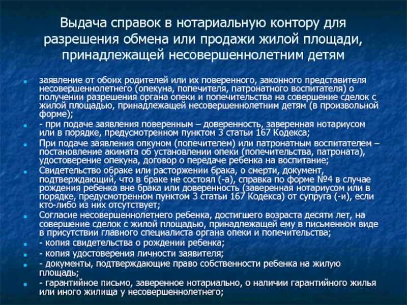 заявление от обоих родителей или их поверенного, законного представителя несовершеннолетнего (опекуна, попечителя, патронатного воспитателя) о получении разрешения органа опеки и попечительства на совершение сделок с жилой площадью, принадлежащей несовершеннолетним детям (в произвольной форме);