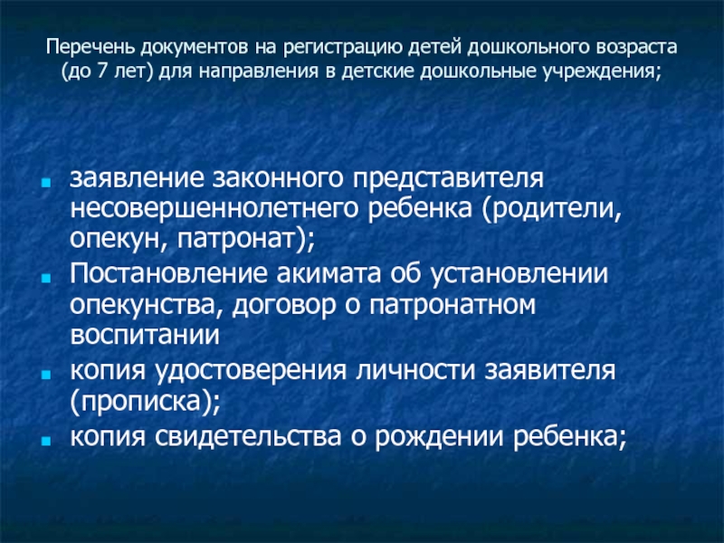 При подаче заявления опкуном (попечителем) или патронатным воспитателем – постановление акимата об установлении опеки (попечительства, патроната), удостоверение опекуна, договор о передаче ребенка на воспитание;
