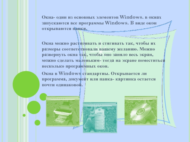 Слайд 4Окна- один из основных элементов Windows. в окнах запускаются все программы