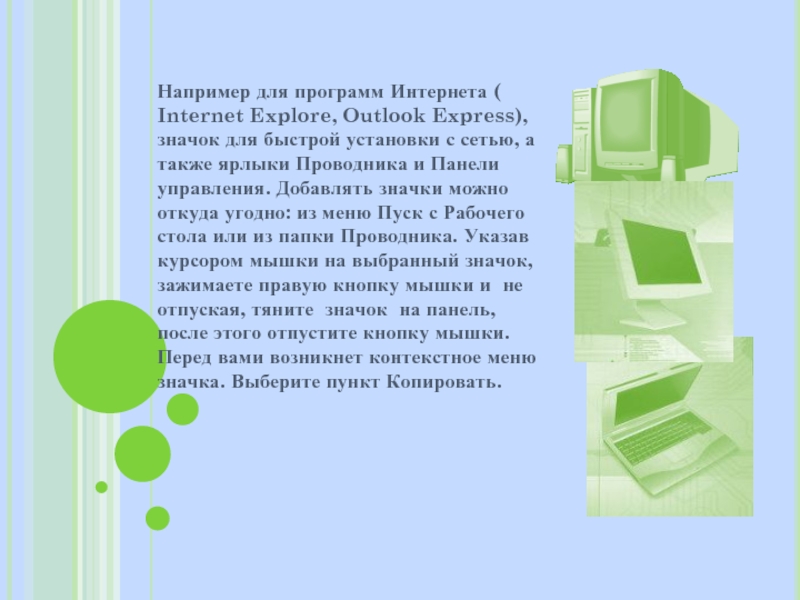 быстрой установки с сетью, а также ярлыки Проводника и Панели управления. Добавлять значки можно откуда угодно: из меню Пуск с Рабочего стола или из папки Проводника. Указав курсором мышки на выбранный значок, зажимаете правую кнопку мышки и не отпуская, тяните значок на панель, после этого отпустите кнопку мышки. Перед вами возникнет контекстное меню значка. Выберите пункт Копировать.