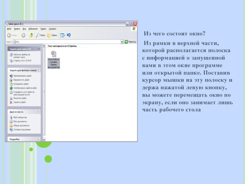 располагается полоска с информацией о запущенной вами в этом окне программе или открытой папке. Поставив курсор мышки на эту полоску и держа нажатой левую кнопку, вы можете перемещать окно по экрану, если оно занимает лишь часть рабочего стола