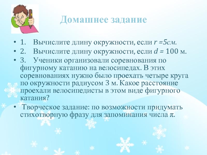 3. Ученики организовали соревнования по фигурному катанию на велосипедах. В этих соревнованиях нужно было проехать четыре круга по окружности радиусом 3 м. Какое расстояние проехали велосипедисты в этом виде фигурного катания?