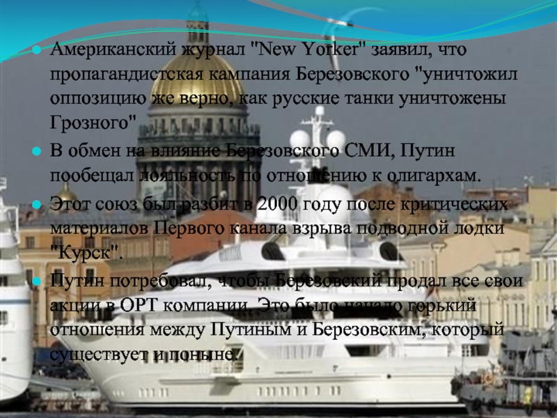 Слайд 11Американский журнал "New Yorker" заявил, что пропагандистская кампания Березовского "уничтожил оппозицию