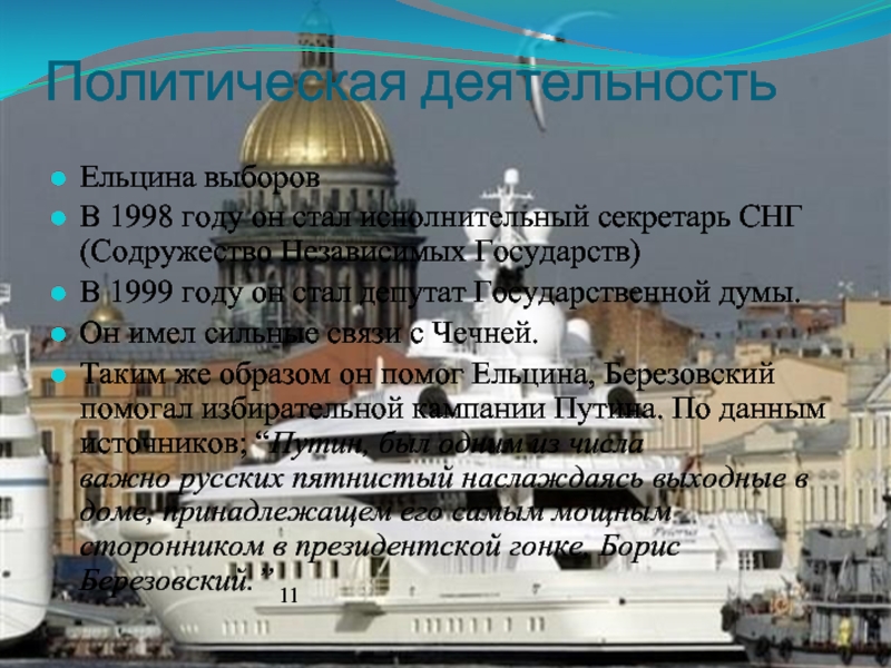 Таким же образом он помог Ельцина, Березовский помогал избирательной кампании Путина. По данным источников; “Путин, был одним из числа