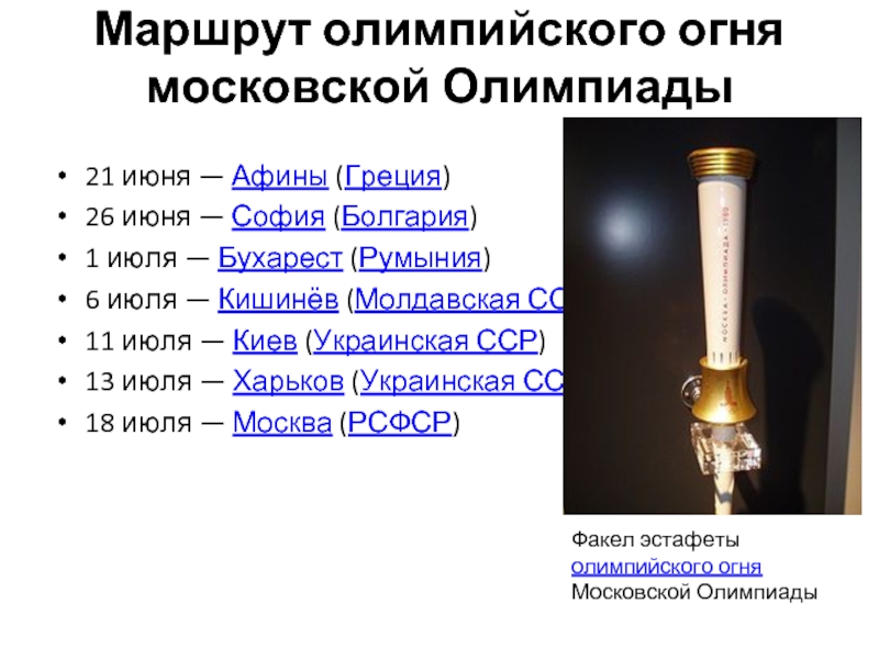 Слайд 7Маршрут олимпийского огня московской Олимпиады