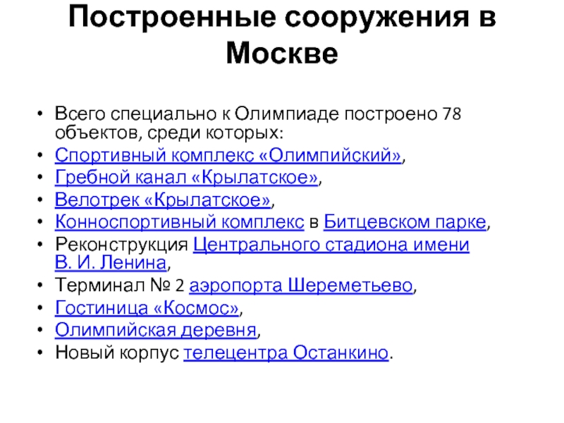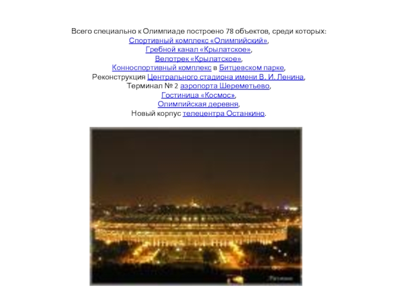 Слайд 31Всего специально к Олимпиаде построено 78 объектов, среди которых: