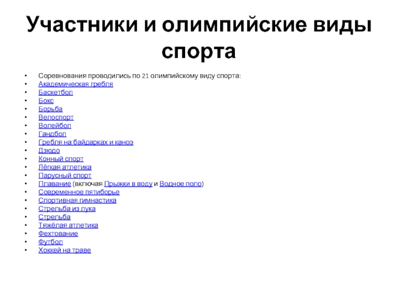 Соревнования проводились по 21 олимпийскому виду спорта: