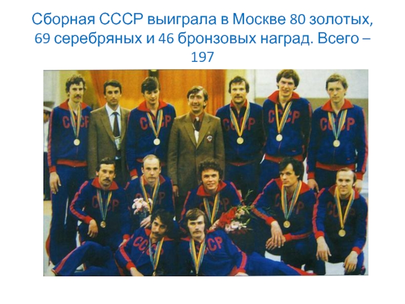 Слайд 27Сборная СССР выиграла в Москве 80 золотых, 69 серебряных и 46