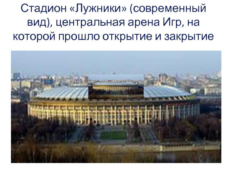 Слайд 18Стадион «Лужники» (современный вид), центральная арена Игр, на которой прошло открытие