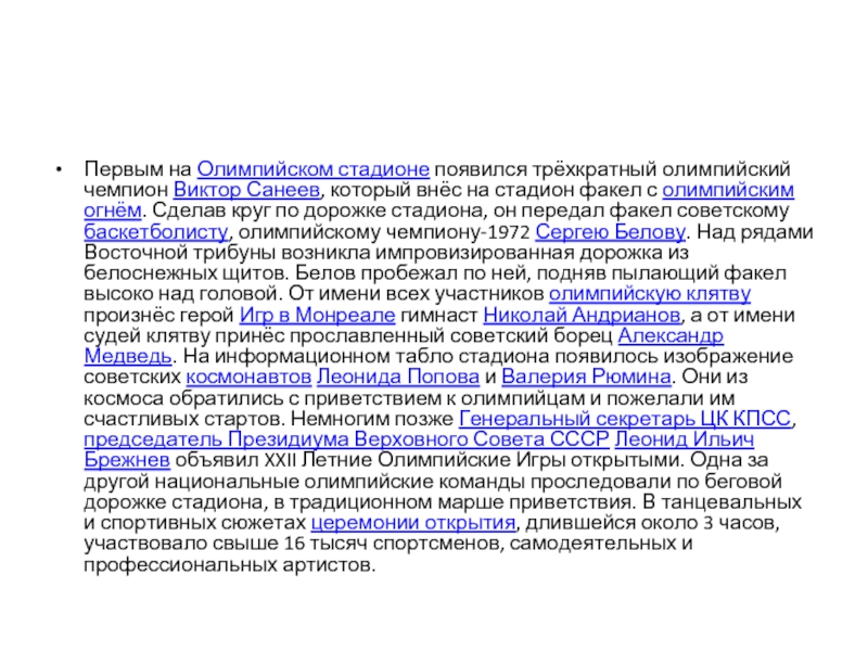 внёс на стадион факел с олимпийским огнём. Сделав круг по дорожке стадиона, он передал факел советскому баскетболисту, олимпийскому чемпиону-1972 Сергею Белову. Над рядами Восточной трибуны возникла импровизированная дорожка из белоснежных щитов. Белов пробежал по ней, подняв пылающий факел высоко над головой. От имени всех участников олимпийскую клятву произнёс герой Игр в Монреале гимнаст Николай Андрианов, а от имени судей клятву принёс прославленный советский борец Александр Медведь. На информационном табло стадиона появилось изображение советских космонавтов Леонида Попова и Валерия Рюмина. Они из космоса обратились с приветствием к олимпийцам и пожелали им счастливых стартов. Немногим позже Генеральный секретарь ЦК КПСС, председатель Президиума Верховного Совета СССР Леонид Ильич Брежнев объявил XXII Летние Олимпийские Игры открытыми. Одна за другой национальные олимпийские команды проследовали по беговой дорожке стадиона, в традиционном марше приветствия. В танцевальных и спортивных сюжетах церемонии открытия, длившейся около 3 часов, участвовало свыше 16 тысяч спортсменов, самодеятельных и профессиональных артистов.
