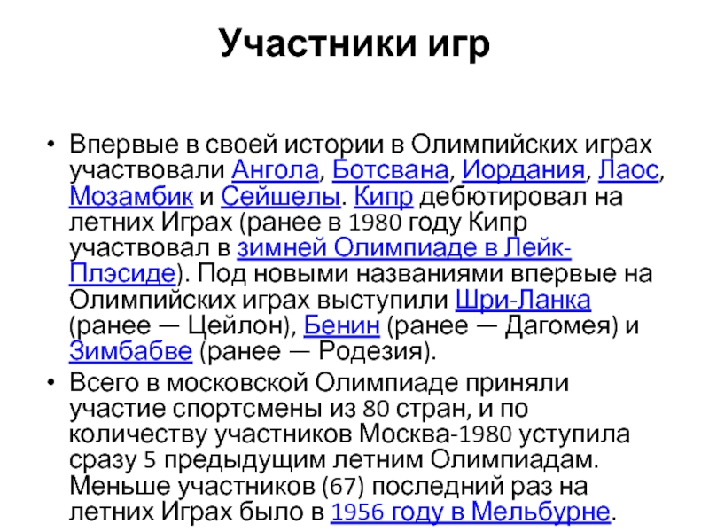 Всего в московской Олимпиаде приняли участие спортсмены из 80 стран, и по количеству участников Москва-1980 уступила сразу 5 предыдущим летним Олимпиадам. Меньше участников (67) последний раз на летних Играх было в 1956 году в Мельбурне.