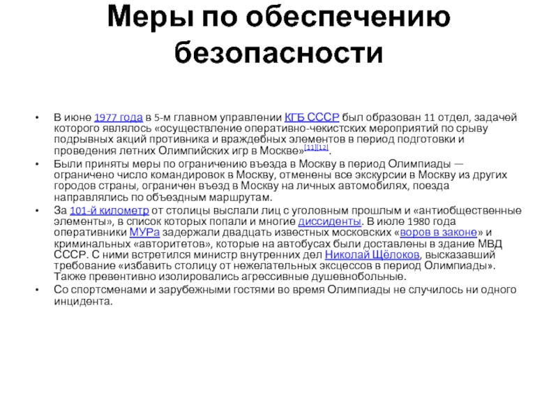 управлении КГБ СССР был образован 11 отдел, задачей которого являлось «осуществление оперативно-чекистских мероприятий по срыву подрывных акций противника и враждебных элементов в период подготовки и проведения летних Олимпийских игр в Москве»[11][12].