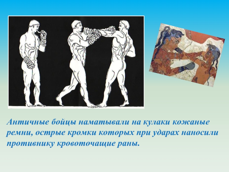 Слайд 9Античные бойцы наматывали на кулаки кожаные ремни, острые кромки которых при