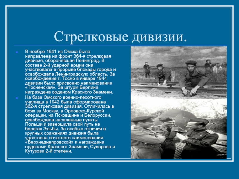 На базе Омского военно-пехотного училища в 1942 была сформирована 362-я стрелковая дивизия. Отличилась в боях за Москву, в Орловско-Курской операции, на Псковщине и Белоруссии, освобождала населенные пункты Польши и завершила свой путь на берегах Эльбы. За особые отличия в крупных сражениях дивизия была удостоена почетного наименования «Верхнеднепровской» и награждена орденами Красного Знамени, Суворова и Кутузова 2-й степени.