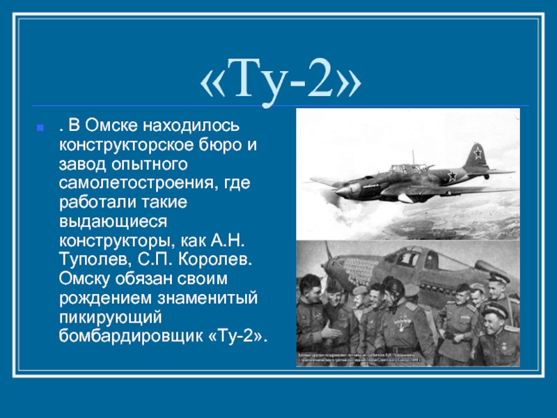 работали такие выдающиеся конструкторы, как А.Н. Туполев, С.П. Королев. Омску обязан своим рождением знаменитый пикирующий бомбардировщик «Ту-2».