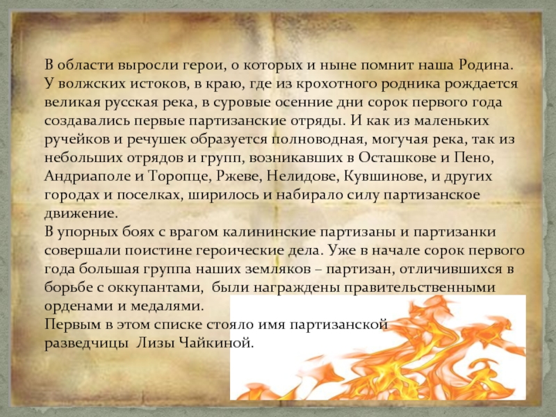 Героический образ Лизы Чайкиной вел наших бойцов в бой против фашистов наполняя сердца местью к врагу.