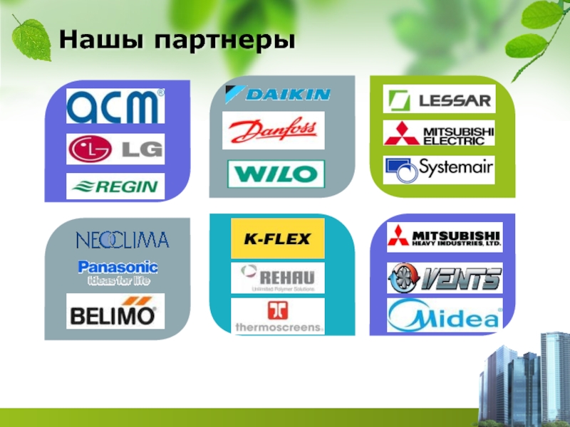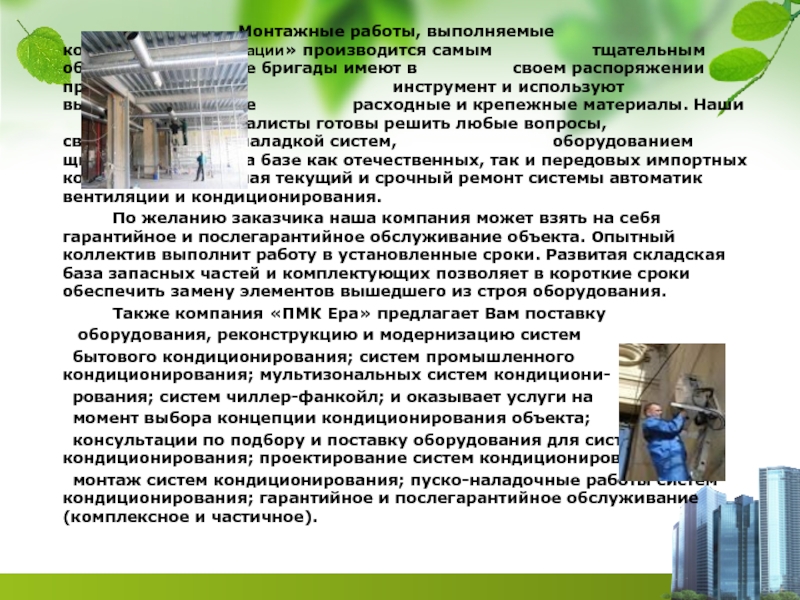 монтаж систем кондиционирования; пуско-наладочные работы систем кондиционирования; гарантийное и послегарантийное обслуживание (комплексное и частичное).