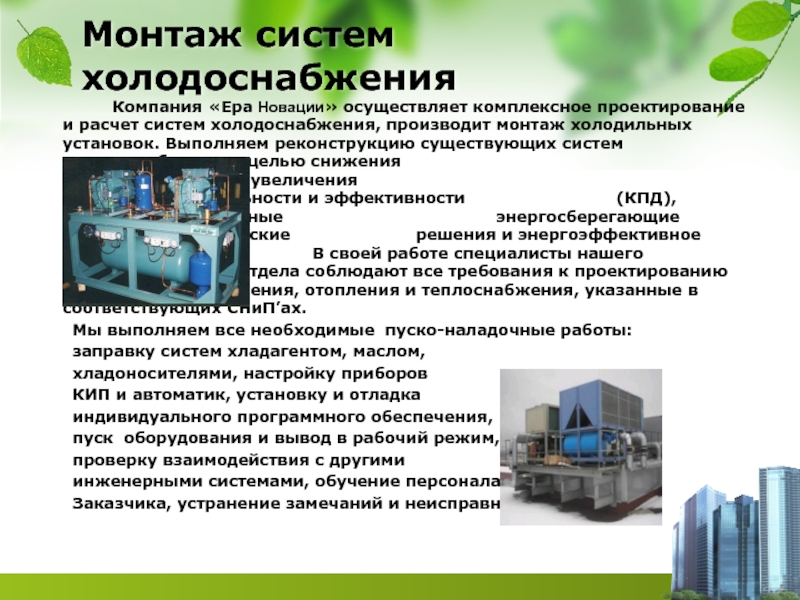 холодоснабжения, производит монтаж холодильных установок. Выполняем реконструкцию существующих систем холодоснабжения с целью снижения энергопотребления, увеличения холодопроизвоительности и эффективности (КПД), используя современные энергосберегающие технологии, технические решения и энергоэффективное оборудовани. В своей работе специалисты нашего проектного отдела соблюдают все требования к проектированию систем холодоснабжения, отопления и теплоснабжения, указанные в соответствующих СНиП’ах.