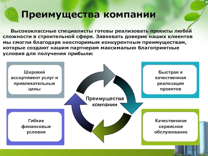имеющая позитивный опыт комплексного решения строительных проектов. Использование современных строительных технологий, кадровый, технический и интеллектуальный потенциал компании позволяет реализовать проекты любого уровня сложности от проектирования и согласования проектной документации, проведения ремонтно-строительных и отделочных работ, капитального ремонта, реконструкции и реставрации промышленных, офисных и жилых зданий до ввода в эксплуатацию сооружений различного назначения.
