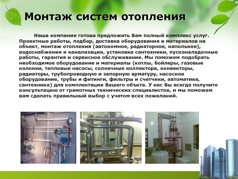 работы, подбор, доставка оборудования и материалов на объект, монтаж отопления (автономное, радиаторное, напольное), водоснабжения и канализации, установка сантехники, пусконаладочные работы, гарантия и сервисное обслуживание. Мы поможем подобрать необходимое оборудование и материалы (котлы, бойлеры, газовые колонки, тепловые насосы, солнечные коллектора, конвекторы, радиаторы, трубопроводную и запорную арматуру, насосное оборудование, трубы и фитинги, фильтры и счетчики, автоматика, сантехника) для комплектации Вашего объкта. У нас Вы всегда получите консультацию от грамотных технических специалистов, и мы поможем вам сделать правильный выбор с учетом всех пожеланий.