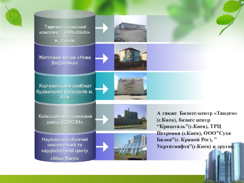А также Бизнес-центр «Тандем»(г.Киев), бизнес центр “Кришталь”(г.Киев), ТРЦ Петровка (г.Киев), ООО”Суха Балка”(г. Кривой Рог), ”Укртатнафта”(г.Киев) и другие.