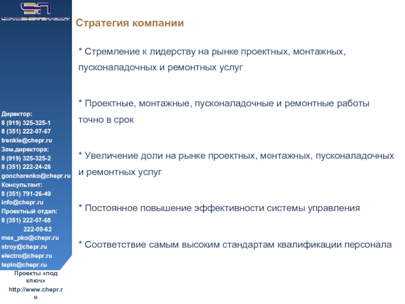 * Стремление к лидерству на рынке проектных, монтажных, пусконаладочных и