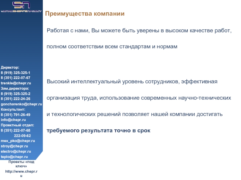 Высокий интеллектуальный уровень сотрудников, эффективная организация труда, использование современных научно-технических и технологических решений позволяет нашей компании достигать требуемого результата точно в срок