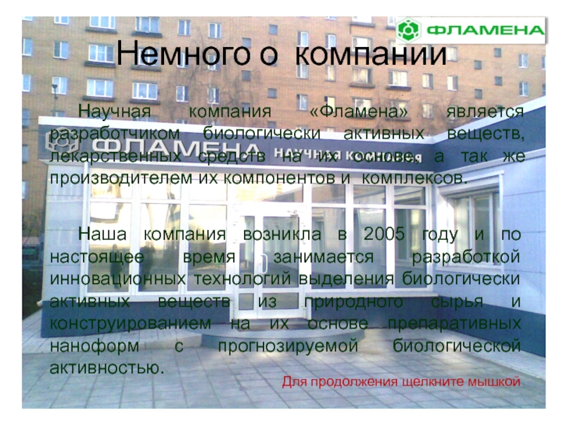 Наша компания возникла в 2005 году и по настоящее время занимается разработкой инновационных технологий выделения биологически активных веществ из природного сырья и конструированием на их основе препаративных наноформ с прогнозируемой биологической активностью.
