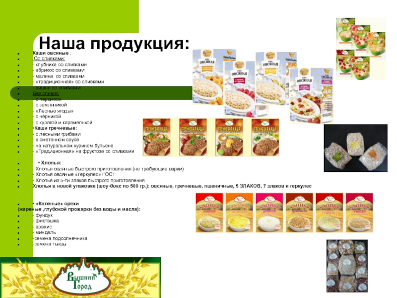 -изготовление цельнозерновой муки и хлопьев из различных злаков, бобовых и гречихи. При изготовлении цельнозерновой муки и хлопьев используются собственные уникальные технологии переработки, разработанные совместно с учеными из Московского Государственного Университета пищевых производств, которые позволяют максимально сохранять полезные свойства цельного зерна и имеют улучшенный вкус .
