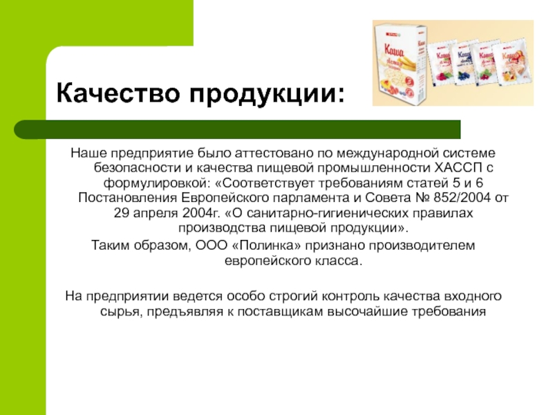 пищевой промышленности ХАССП с формулировкой: «Соответствует требованиям статей 5 и 6 Постановления Европейского парламента и Совета № 852/2004 от 29 апреля 2004г. «О санитарно-гигиенических правилах производства пищевой продукции».