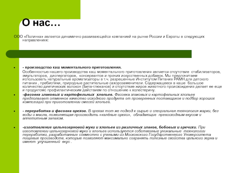 Особенностью нашего производства каш моментального приготовления является отсутствие стабилизаторов, эмульгаторов, диспергаторов, консервантов и прочих искусственных добавок. Мы предпочитаем использовать натуральные ароматизаторы в т.ч. разрешенные Институтом Питания РАМН для детского питания , пребиотики, природные растительные сахорозаменители. Содержащееся в каше большое количество диетических волокон (Бета-глюканов) и отсутствие жиров животного происхождения делает ее еще и продуктомс профилактическим действием по отношению к холестерину.