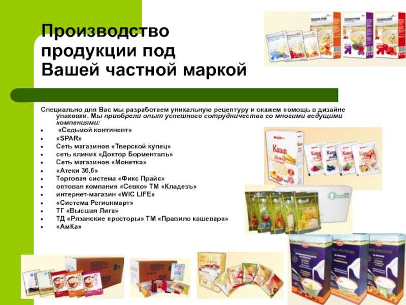 рецептуру и окажем помощь в дизайне упаковки. Мы приобрели опыт успешного сотрудничества со многими ведущими компаниями: