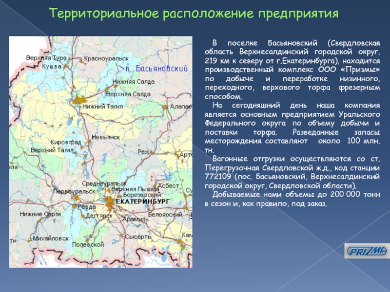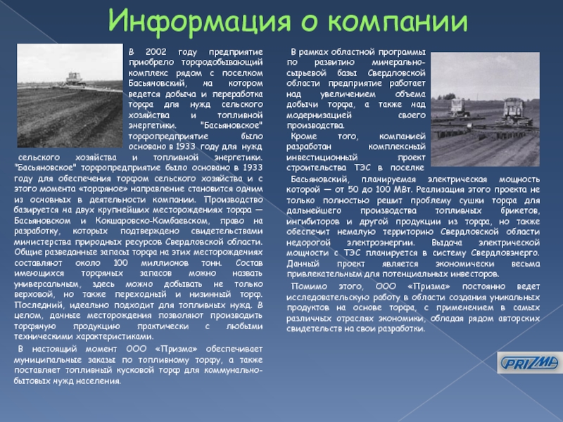 сельского хозяйства и топливной энергетики. "Басьяновское" торфопредприятие было основано в 1933 году для обеспечения торфом сельского хозяйства и с этого момента «торфяное» направление становится одним из основных в деятельности компании. Производство базируется на двух крупнейших месторождениях торфа — Басьяновском и Кокшаровско-Комбаевском, право на разработку, которых подтверждено свидетельствами министерства природных ресурсов Свердловской области. Общие разведанные запасы торфа на этих месторождениях составляют около 100 миллионов тонн. Состав имеющихся торфяных запасов можно назвать универсальным, здесь можно добывать не только верховой, но также переходный и низинный торф. Последний, идеально подходит для топливных нужд. В целом, данные месторождения позволяют производить торфяную продукцию практически с любыми техническими характеристиками.