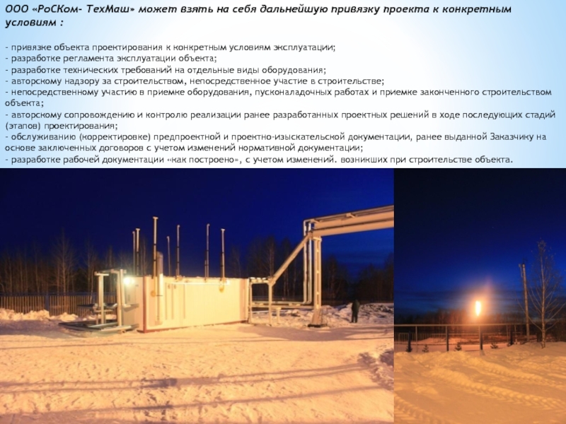 Типовой проект разработан для многократного применения при строительстве повторяющихся производственно стабильных технологических процессов. Типовой проект «Утилизация попутного нефтяного газа (ПНГ)» может быть применим на любом месторождении.