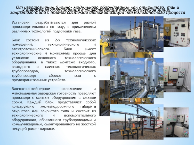 Блочно–контейнерное исполнение и максимальная заводская готовность позволяют производить монтаж оборудования в сжатые сроки. Каждый блок представляет собой конструкцию железнодорожного габарита открытого или закрытого типа и состоит из технологического и вспомогательного оборудования, обвязанного трубопроводами и коммуникациями, смонтированного на жесткой несущей раме – каркасе.