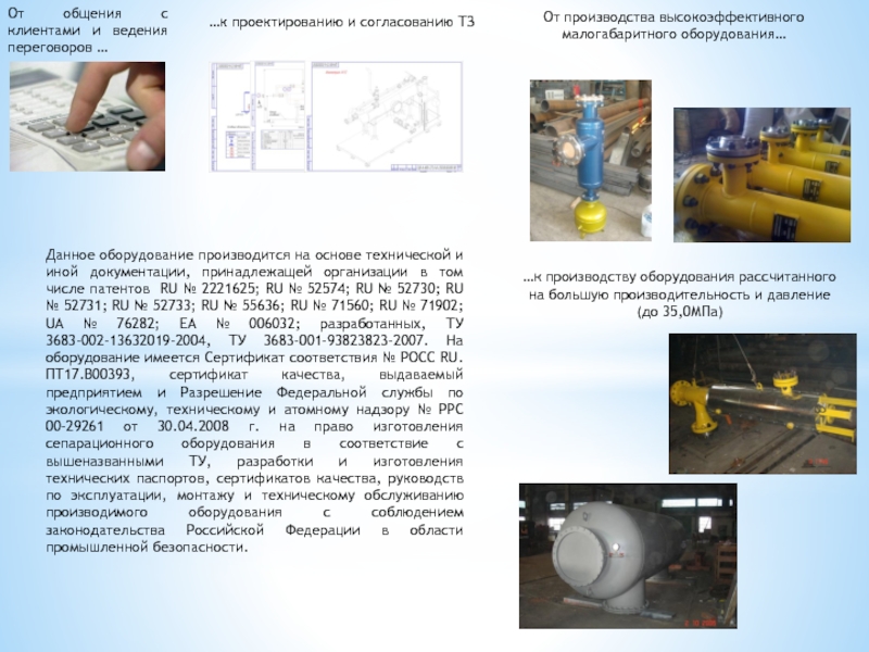 Данное оборудование производится на основe технической и иной документации, принадлежащей организации в том числе патентов RU № 2221625; RU № 52574; RU № 52730; RU № 52731; RU № 52733; RU № 55636; RU № 71560; RU № 71902; UA № 76282; ЕА № 006032; разработанных, ТУ 3683-002-13632019-2004, ТУ 3683-001-93823823-2007. На оборудование имеется Сертификат соответствия № РОСС RU.ПТ17.В00393, сертификат качества, выдаваемый предприятием и Разрешение Федеральной службы по экологическому, техническому и атомному надзору № РРС 00-29261 от 30.04.2008 г. на право изготовления сепарационного оборудования в соответствие с вышеназванными ТУ, разработки и изготовления технических паспортов, сертификатов качества, руководств по эксплуатации, монтажу и техническому обслуживанию производимого оборудования с соблюдением законодательства Российской Федерации в области промышленной безопасности.