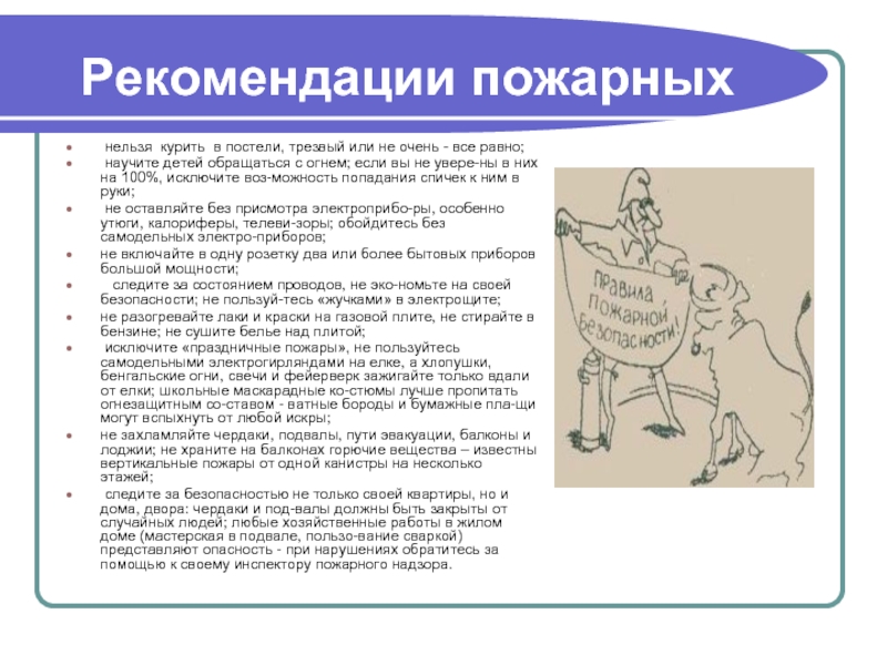 не оставляйте без присмотра электроприборы, особенно утюги, калориферы, телевизоры; обойдитесь без самодельных электроприборов;