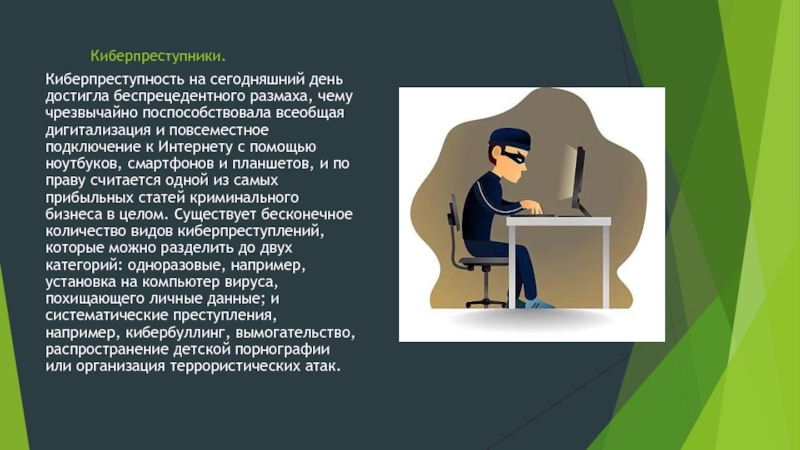 дигитализация и повсеместное подключение к Интернету с помощью ноутбуков, смартфонов и планшетов, и по праву считается одной из самых прибыльных статей криминального бизнеса в целом. Существует бесконечное количество видов киберпреступлений, которые можно разделить до двух категорий: одноразовые, например, установка на компьютер вируса, похищающего личные данные; и систематические преступления, например, кибербуллинг, вымогательство, распространение детской порнографии или организация террористических атак.