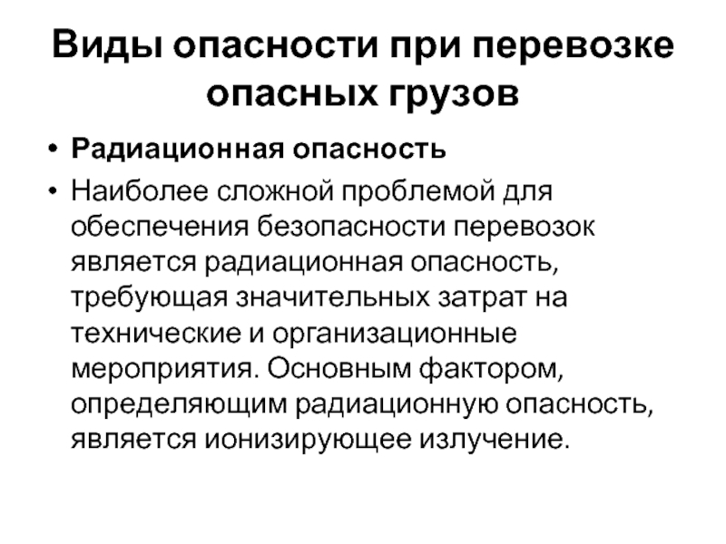безопасности перевозок является радиационная опасность, требующая значительных затрат на технические и организационные мероприятия. Основным фактором, определяющим радиационную опасность, является ионизирующее излучение.