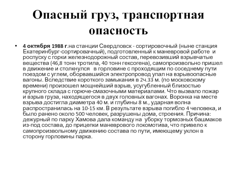 (ныне станция Екатеринбург-сортировачный), подготовленный к маневровой работе и роспуску с горки железнодорожный состав, перевозивший взрывчатые вещества (46,8 тонн тротила, 40 тонн гексогена), самопроизвольно пришел в движение и столкнулся в горловине с проходящим по соседнему пути поездом с углем, оборвавшийся электропровод упал на взрывоопасные вагоны. Вследствие короткого замыкания в 2ч.33 м. (по московскому времени) произошел мощнейший взрыв, усугубленный близостью крупного склада с горюче-смазочными материалами. Что вызвало пожар и взрыв груза, находящегося в двух головных вагонах. Воронка на месте взрыва достигла диаметра 40 м. и глубины 8 м., ударная волна распространилась на 10-15 км. В результате взрыва погибло 4 человека, и было ранено около 500 человек, разрушены дома, строения. Причина: дежурный по парку Хамова дала команду на уборку тормозных башмаков из-под состава, до прицепки маневрового локомотива, что привело к самопроизвольному движению состава по пути, имеющему уклон в сторону горловины парка.