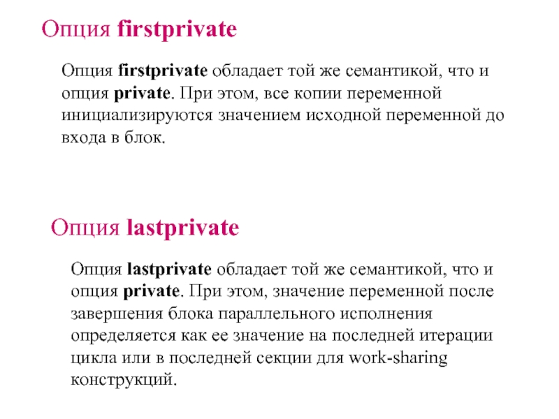 опция private. При этом, значение переменной после завершения блока параллельного исполнения определяется как ее значение на последней итерации цикла или в последней секции для work-sharing конструкций.