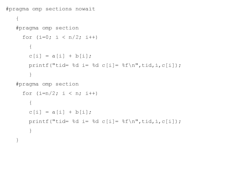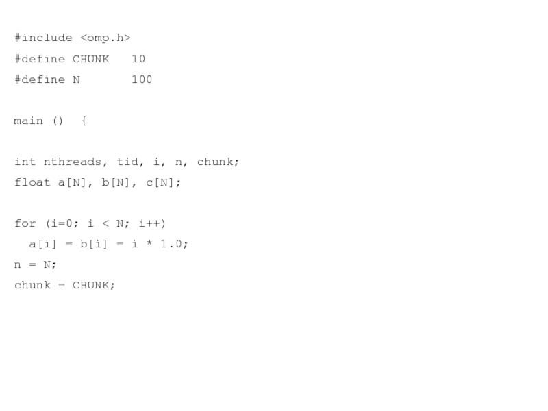 Слайд 24#pragma omp parallel shared(a,b,c,n,chunk) private(i,nthreads,tid)