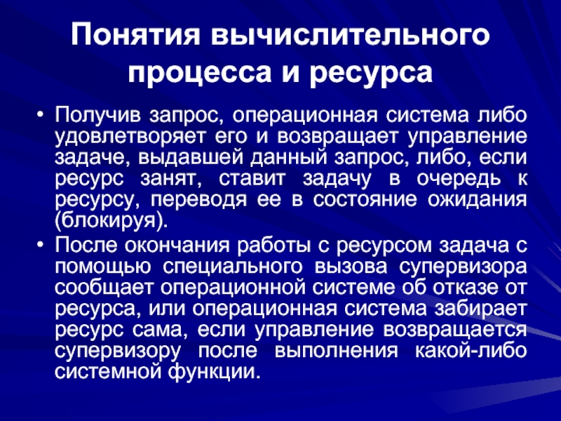 Термин ресурс обычно применяется по отношению к повторно используемым, относительно стабильным и часто недостающим объектам, которые запрашиваются, используются и освобождаются процессами в период их активности.