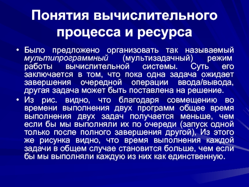 режим работы вычислительной системы. Суть его заключается в том, что пока одна задача ожидает завершения очередной операции ввода/вывода, другая задача может быть поставлена на решение.
