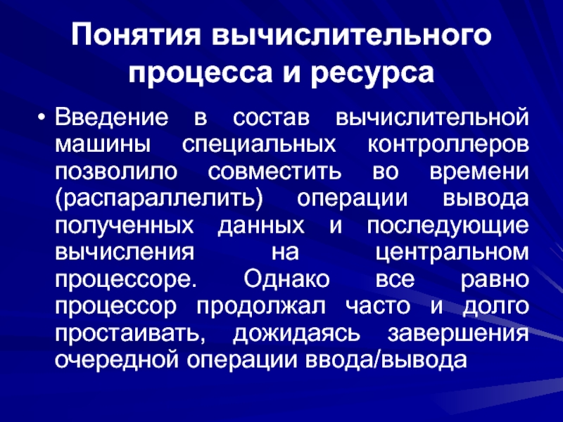 Центральный процессор осуществлял и выполнение вычислений, и управление операциями ввода/вывода данных. Соответственно, пока осуществлялся обмен данными между оперативной памятью и внешними устройствами, процессор не мог выполнять вычисления.