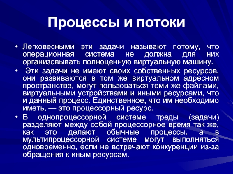 Эти задачи не имеют своих собственных ресурсов, они развиваются в том же виртуальном адресном пространстве, могут пользоваться теми же файлами, виртуальными устройствами и иными ресурсами, что и данный процесс. Единственное, что им необходимо иметь, — это процессорный ресурс.