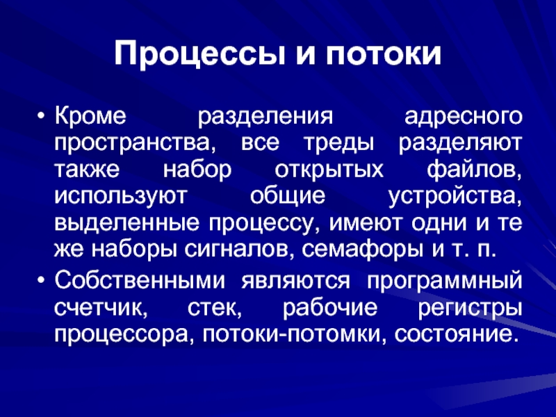 открытых файлов, используют общие устройства, выделенные процессу, имеют одни и те же наборы сигналов, семафоры и т. п.