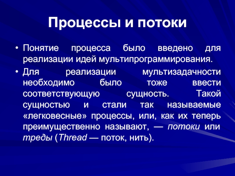 реализации мультизадачности необходимо было тоже ввести соответствующую сущность. Такой сущностью и стали так называемые «легковесные» процессы, или, как их теперь преимущественно называют, — потоки или треды (Thread — поток, нить).